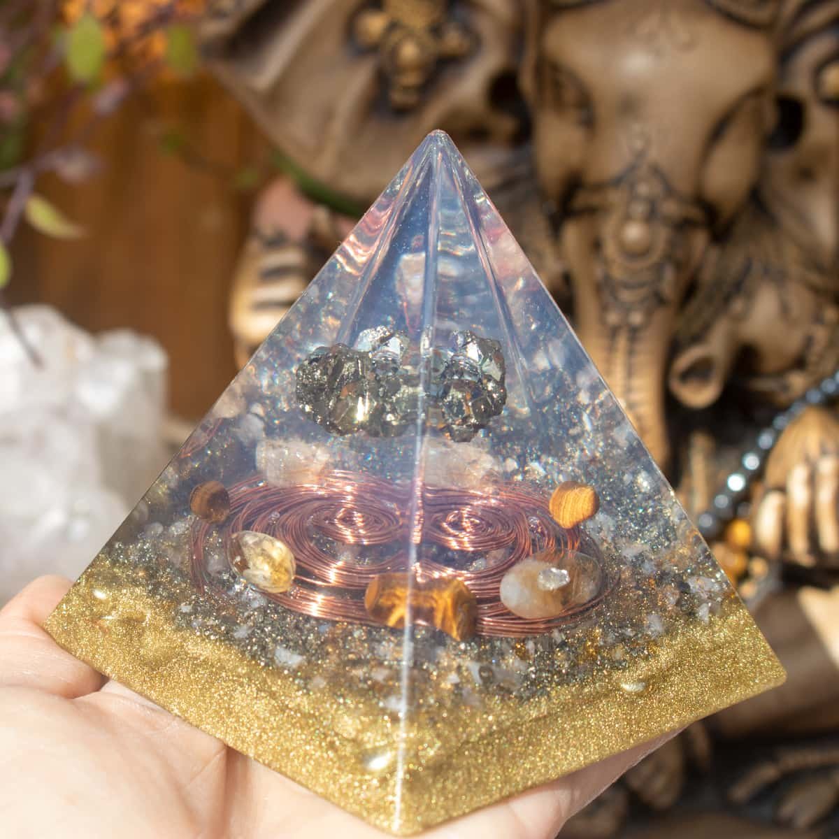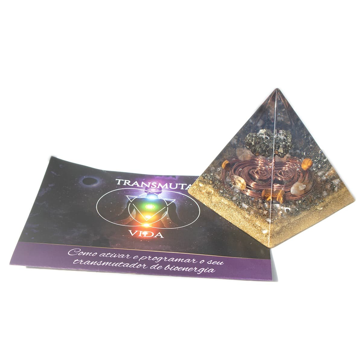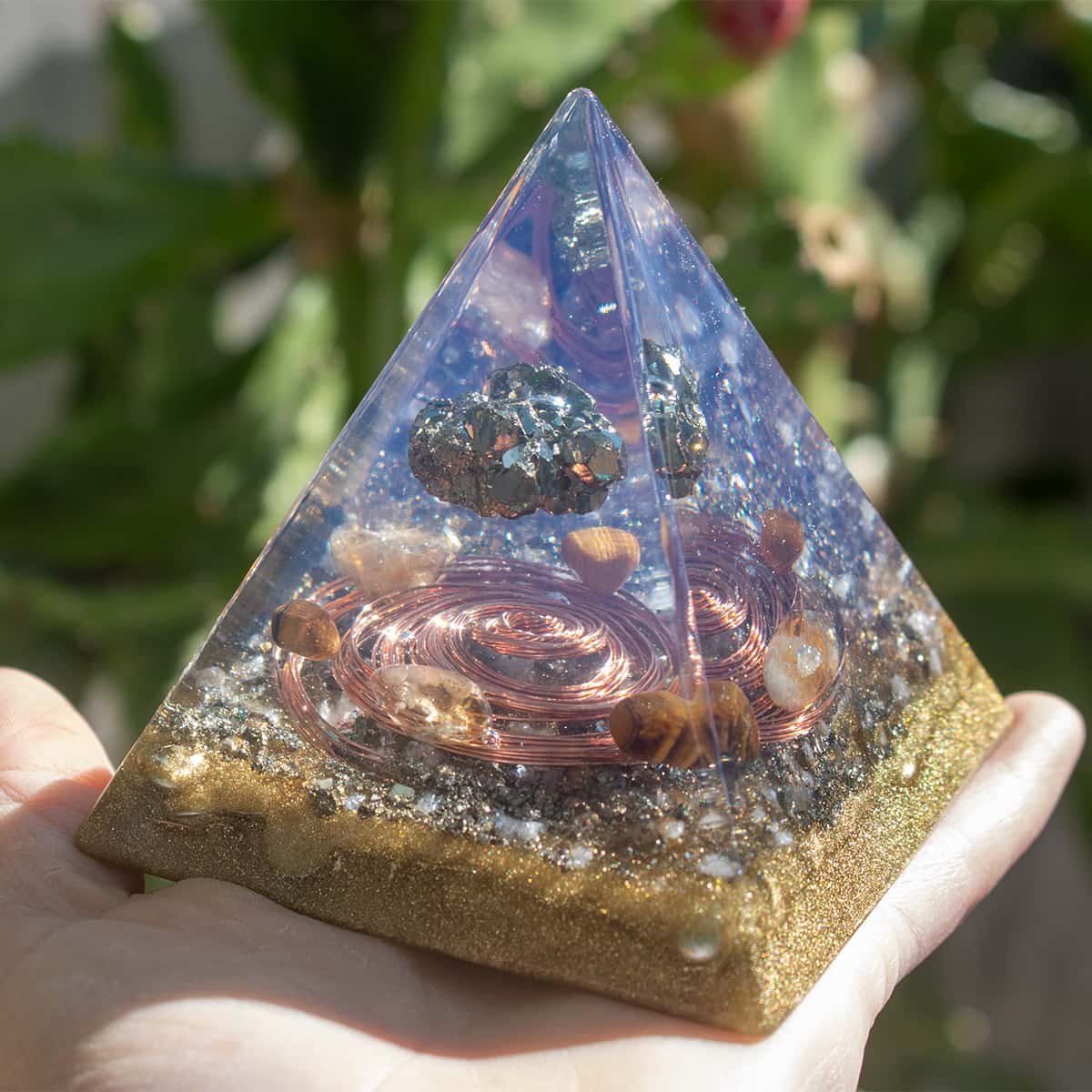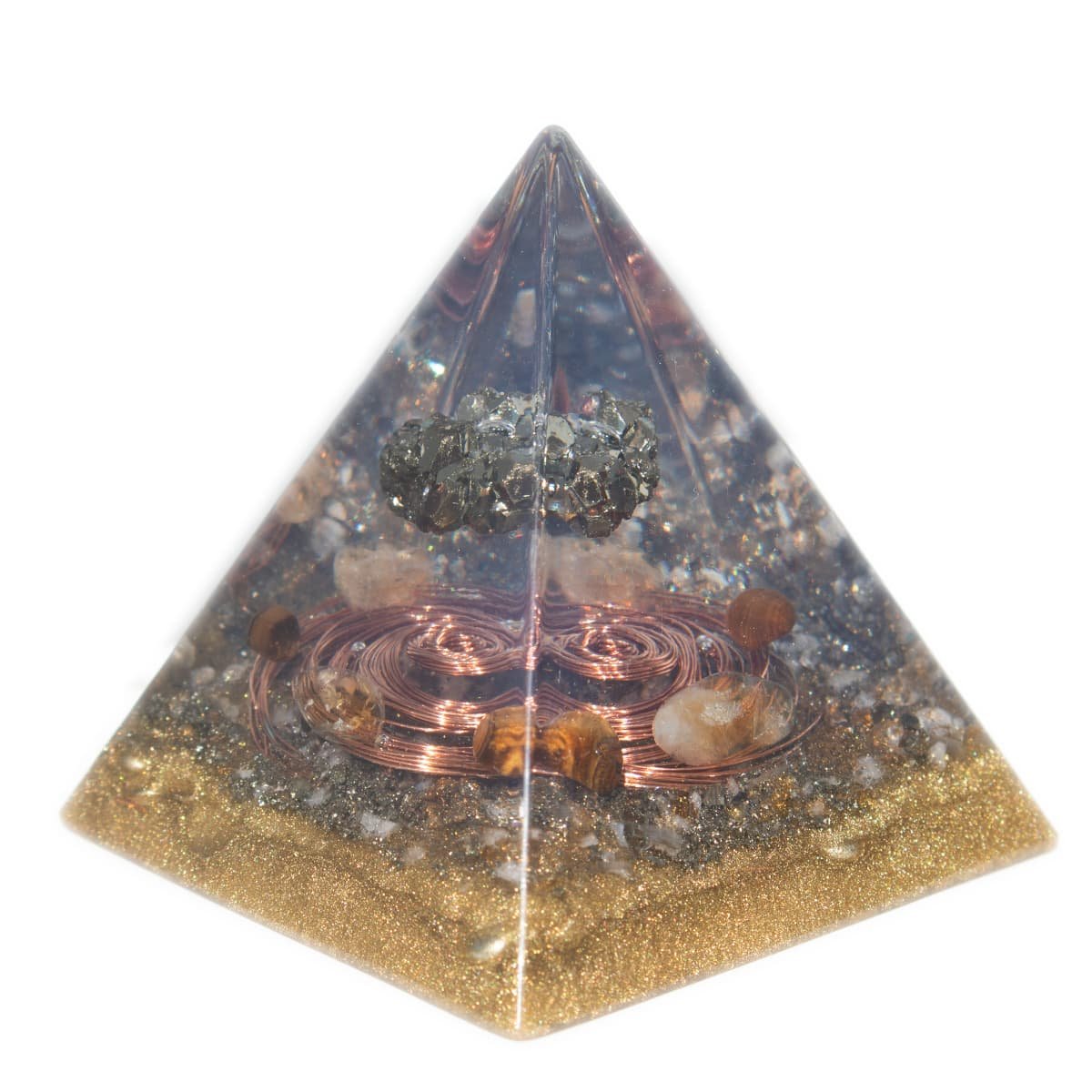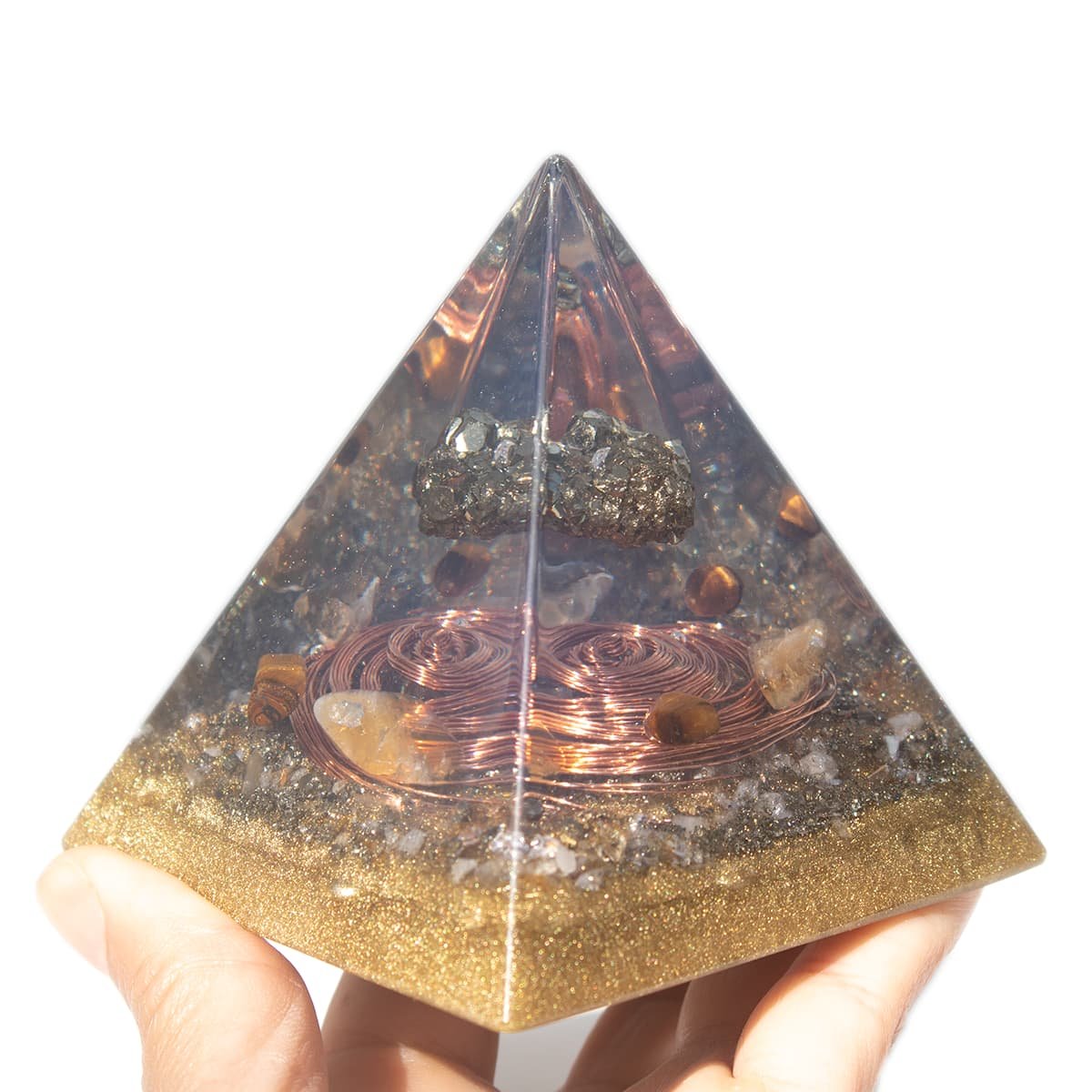 Transforme a energia do seu ambiente com esta pirâmide orgonite poderosa, feita com pedra pirita, conhecida como a pedra da prosperidade.